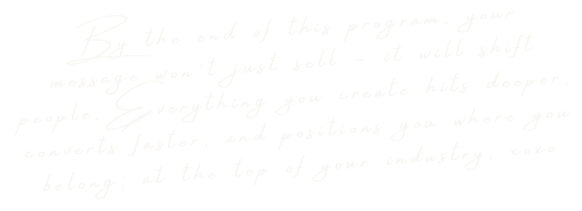 This is where everything fuses together . Here you create a world-class message that: Positions you as the only option, establishes you as the leader of a high-end movement., doesn’t inspire or educate, it claims, activates, and converts on the spot. This is the moment she finally sees who she becomes in your world. And with one sip of your words, she’s already living her next identity.