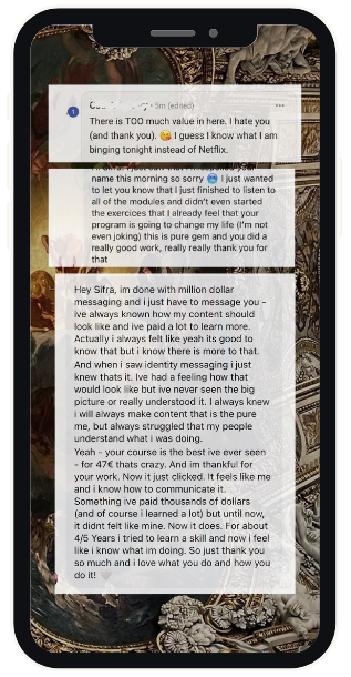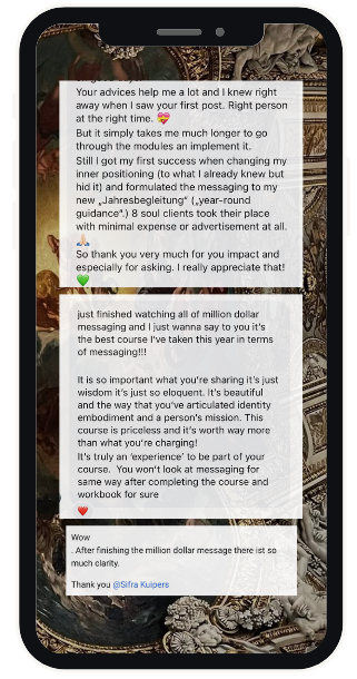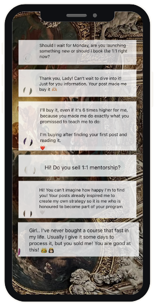 Over 100 soul clients jumped inside The Million Dollar Message within seconds of finding me - no ads, or live launch. Women from every corner of the world started reaching out. Even leaders with multi–million–dollar businesses followed me for 30 minutes and said,“Can we have a call today? I want your 10K mentorship - ASAP.”